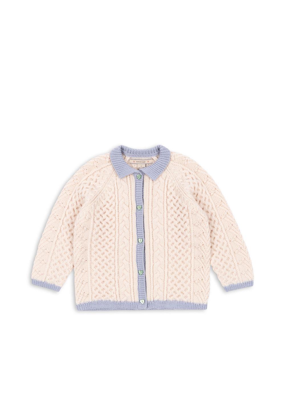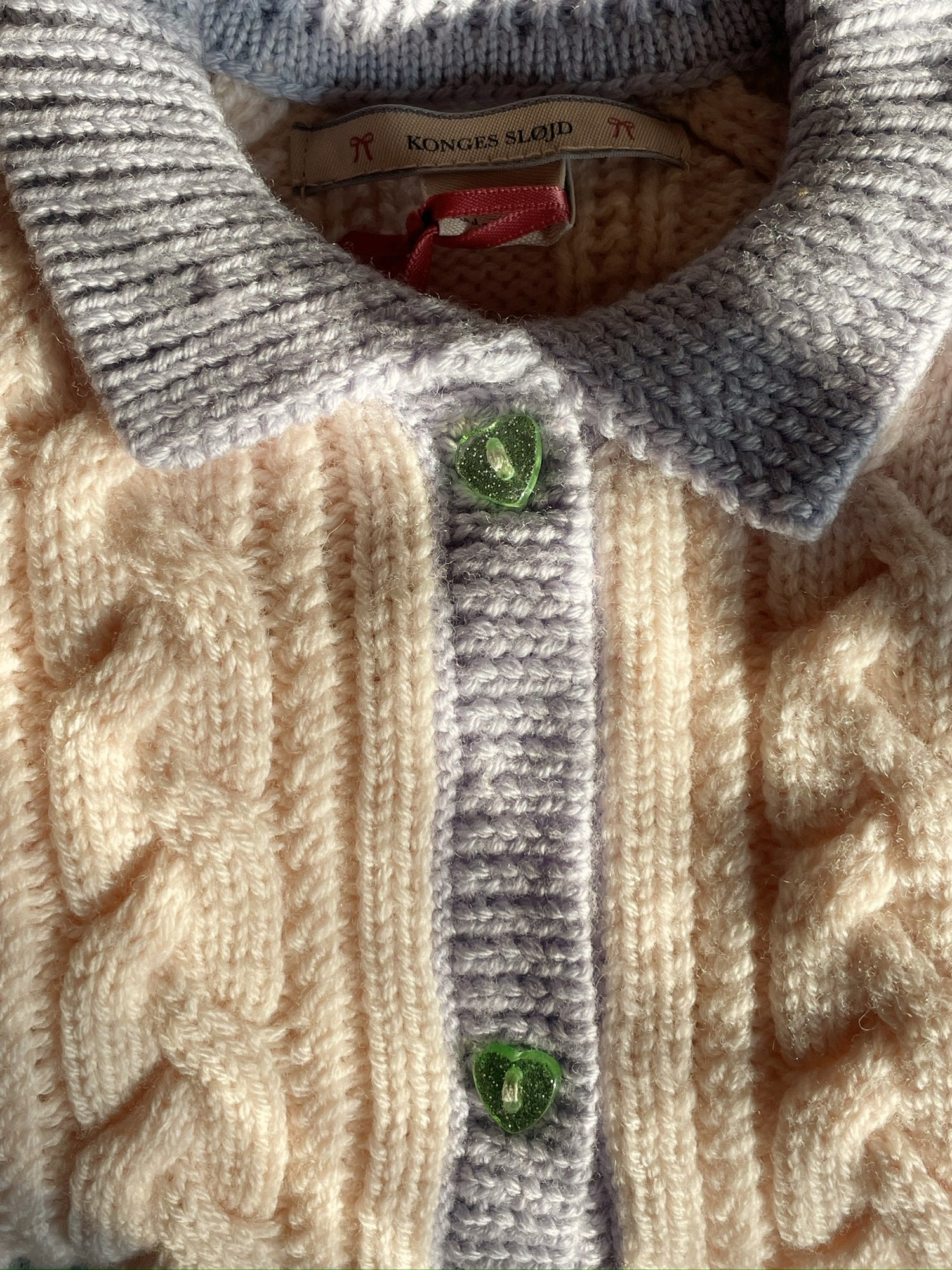 Wrap your little one in timeless comfort with this cream cable knit cardigan, beautifully detailed with lilac contrast trim on the collar, cuffs, and hem. Designed with classic knit patterns and sweet heart-shaped buttons, this cardigan brings both charm and warmth to everyday outfits.