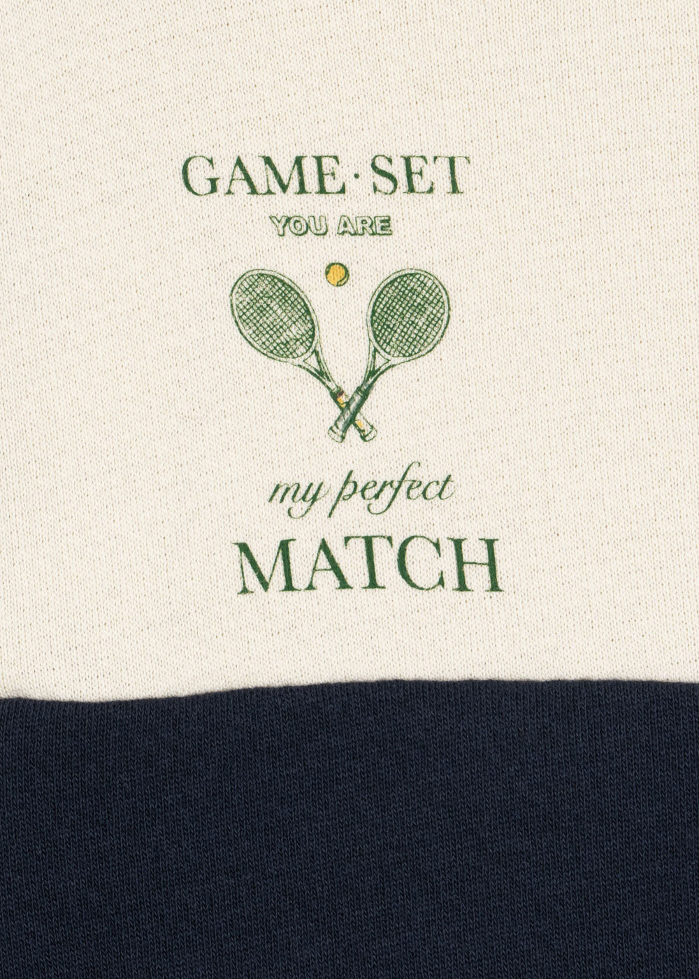 Keep your little one cozy and stylish with this sporty half-zip sweatshirt. Designed in a classic navy and cream color block, this sweatshirt features a playful tennis embroidery that reads “Game. Set. My Perfect Match.” Made from soft cotton blend fabric, it offers comfort, warmth, and durability for everyday wear.