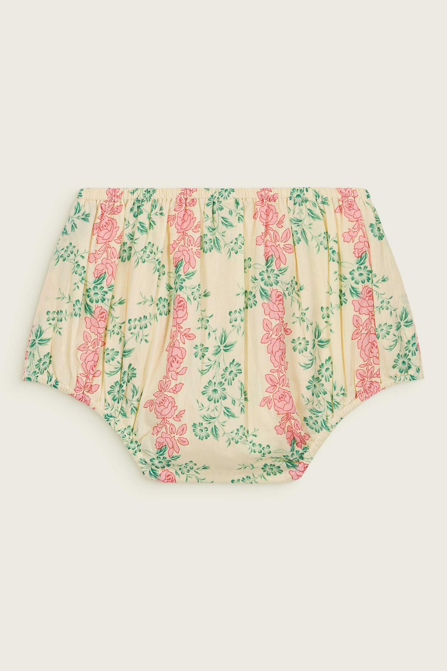 These vintage floral baby bloomers feature a delicate rose print in soft pink and green tones on a warm cream base. Designed with a gently gathered waist and elastic leg openings, they offer comfort, flexibility and an effortlessly classic look.
