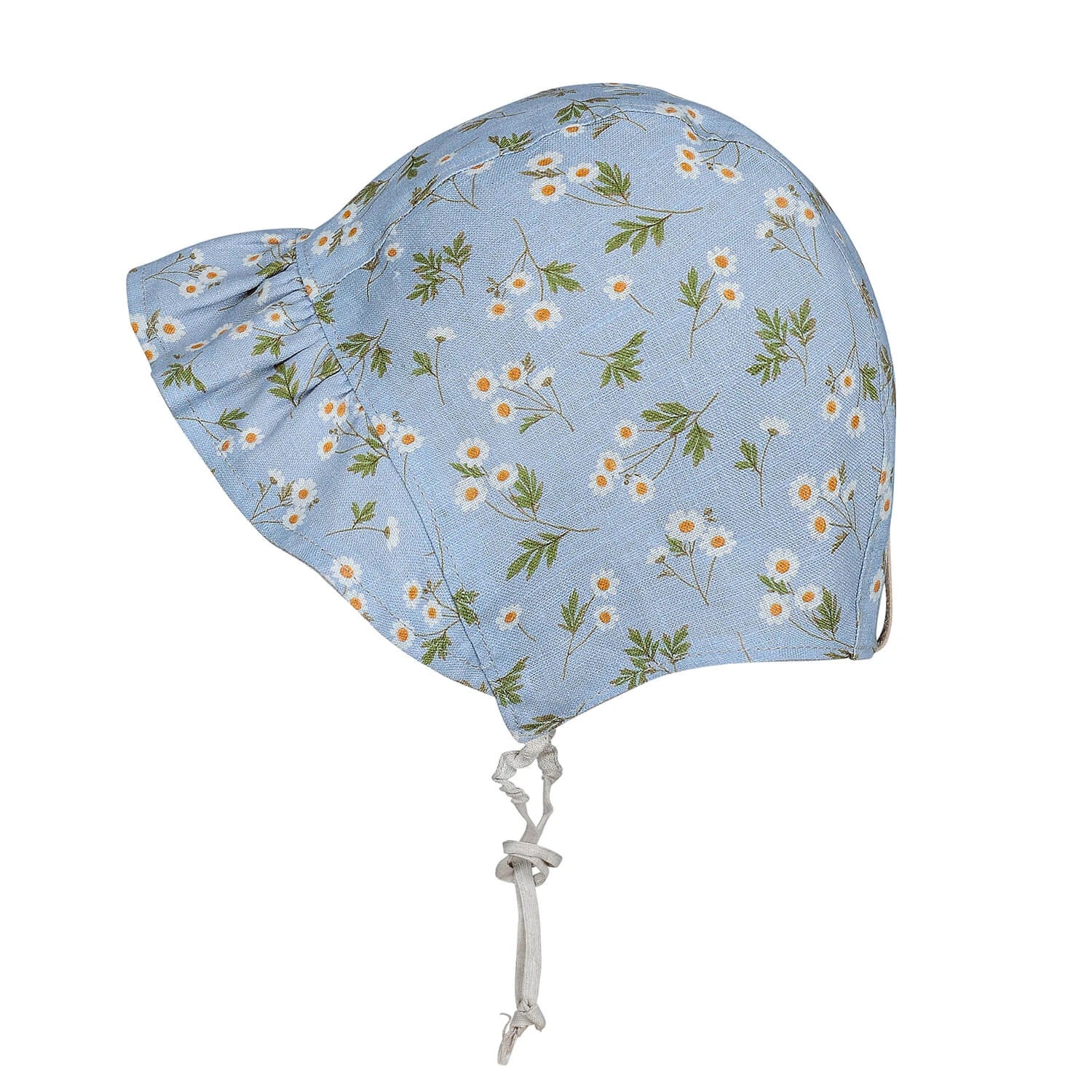 This reversible baby bonnet is crafted from breathable 100% linen and features a delicate blue daisy print. The softly structured brim offers gentle sun protection, while adjustable ties ensure a comfortable and secure fit.