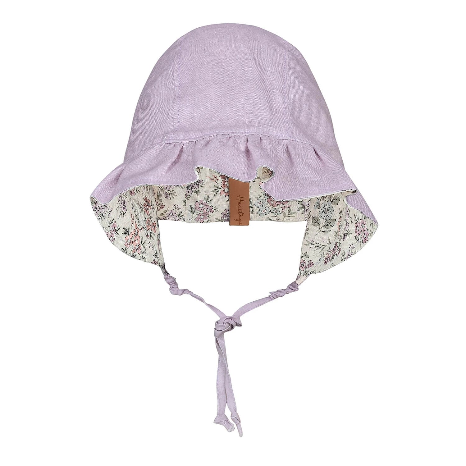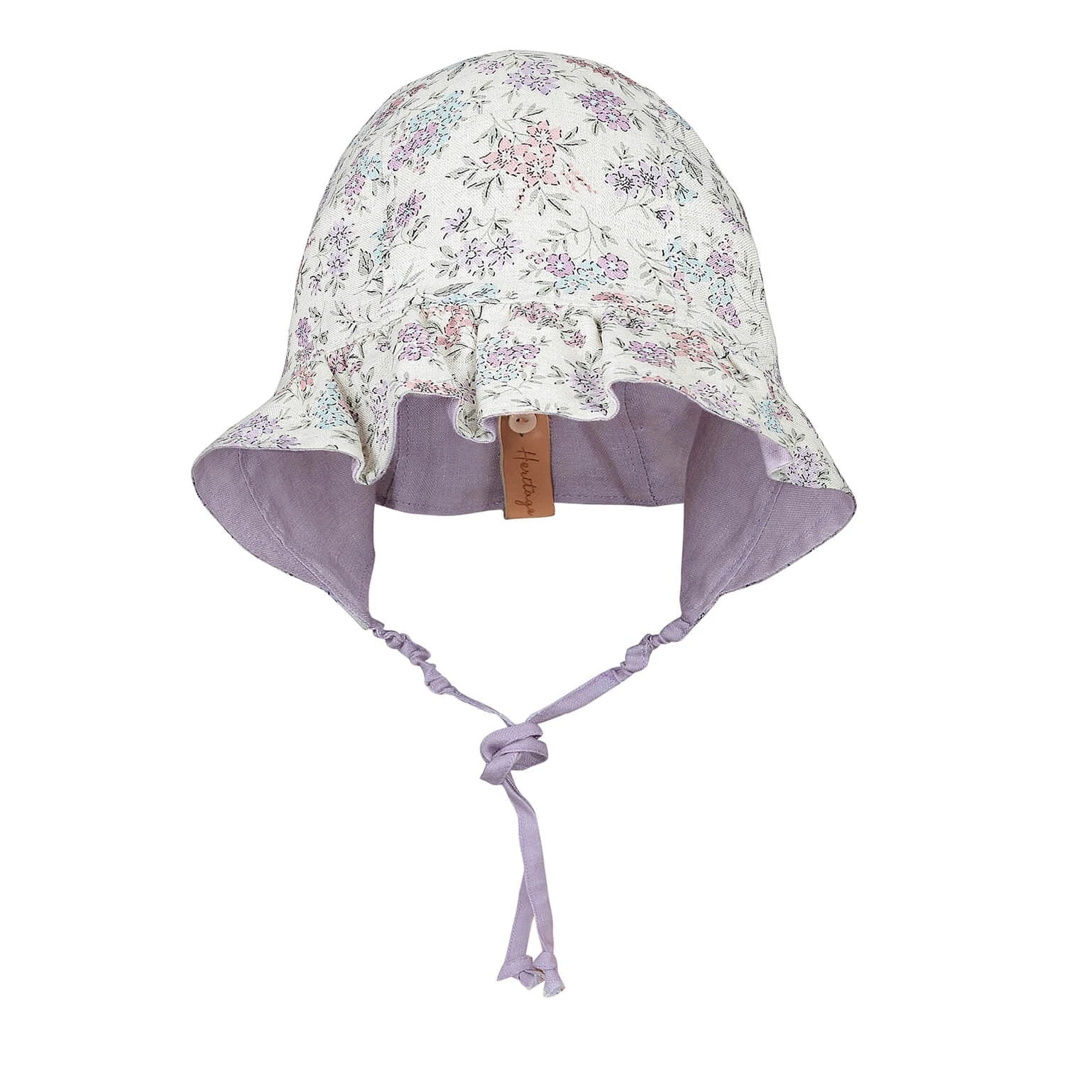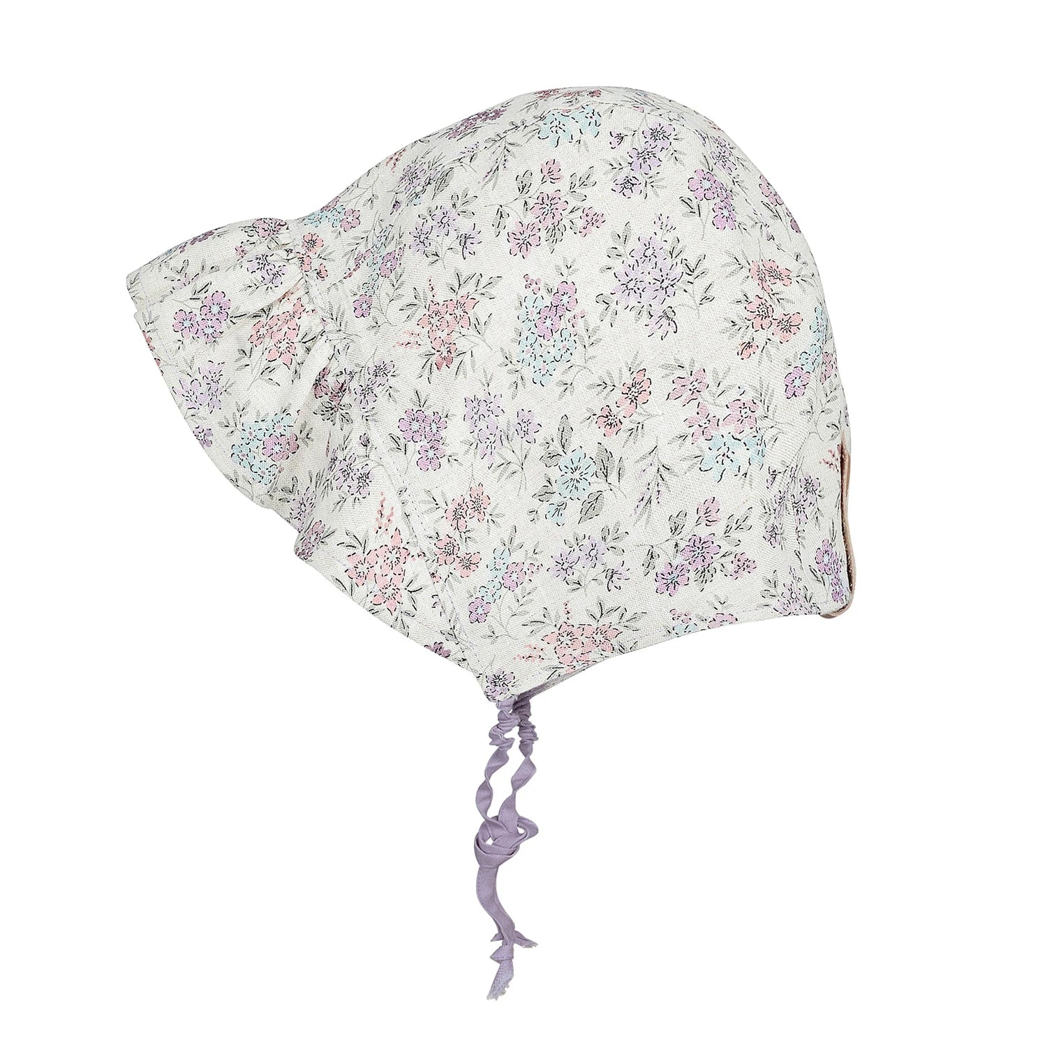 This reversible baby bonnet is crafted from breathable linen and features a delicate vintage floral print in soft purple and pink tones. The gently structured brim provides light sun coverage, while adjustable ties ensure a comfortable fit.