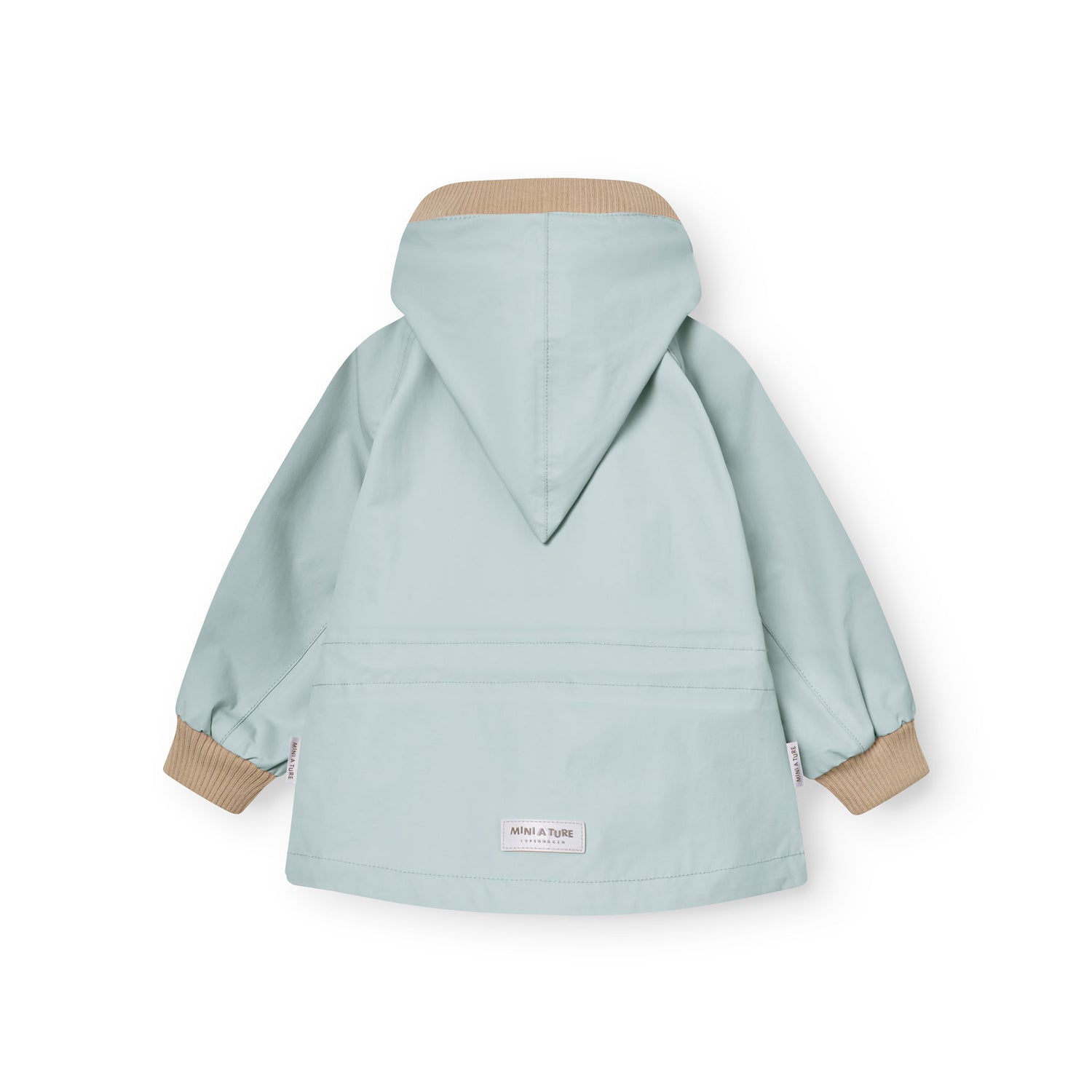 Shop the MINI A TURE waterproof hooded jacket in dusty mint. Breathable Scandinavian raincoat for babies and kids — lightweight, windproof, and stylish.
